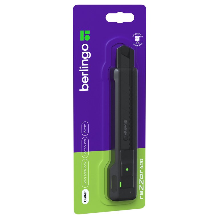 Нож канцелярский с автоматической системой фиксации лезвия auto-lock. Корпус ножа сделан из ABS пластика с покрытием soft touch. Комплектуется износостойким лезвием черного цвета из стали SK2. Ширина лезвия - 18 мм. Модель оснащена дополнительным замком блокировки лезвия. Индивидуальная упаковка - блистер с европодвесом.