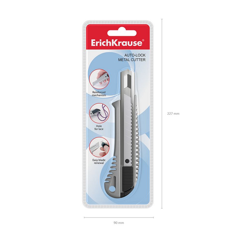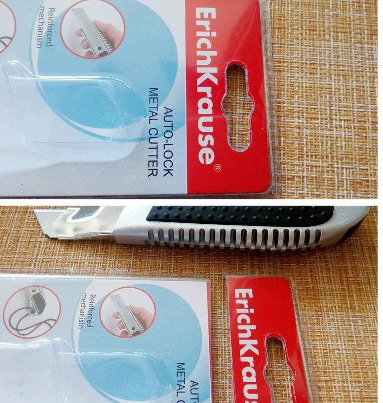 Нож канцелярский Erich Krause с автоматической системой фиксации лезвия auto-lock и насадкой для безопасного отделения сегмента лезвия.
