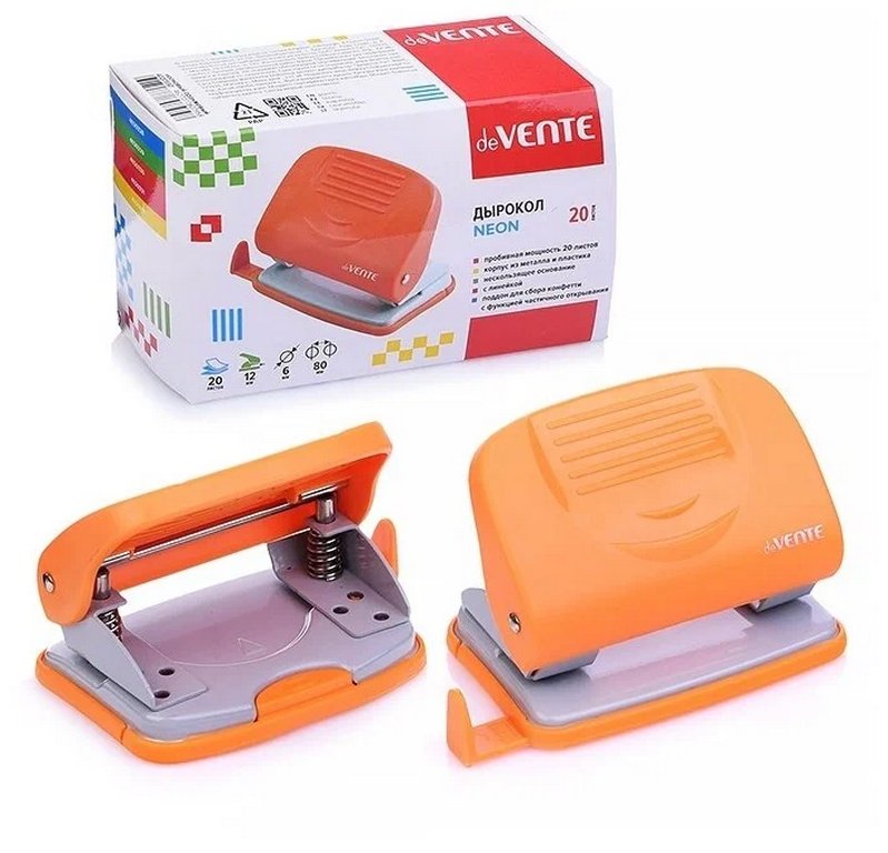 Дырокол "deVENTE. Neon" (20 листов) пластиковый с линейкой, в картонной коробке, неоновый оранжевый.