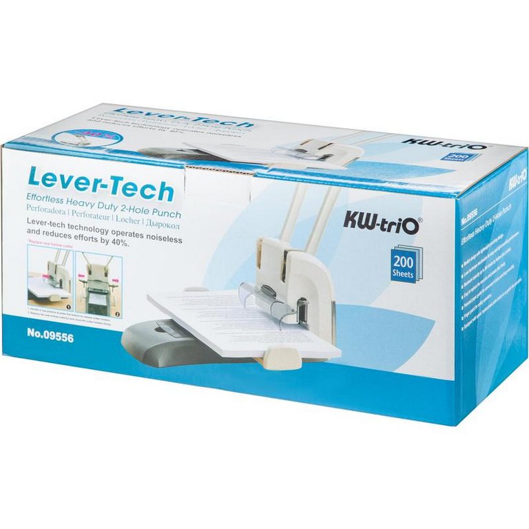 Мощный дырокол KW-Trio Lever-Tech HD с экономией до 50% усилий пользователя. Пробивает одновременно до 200 листов 80 г/м2 благодаря механизму с использованием полых режущих элементов. Перфорирует два отверстия диаметром 6 мм, расстояние между отверстиями 80 мм.