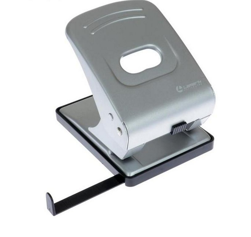 Полностью металлический дырокол Lamark серии Metallic на 2 отверстия диаметром 5,5 мм оснащен линейкой деления на форматы и пластиковым поддоном-основанием для сбора конфетти.