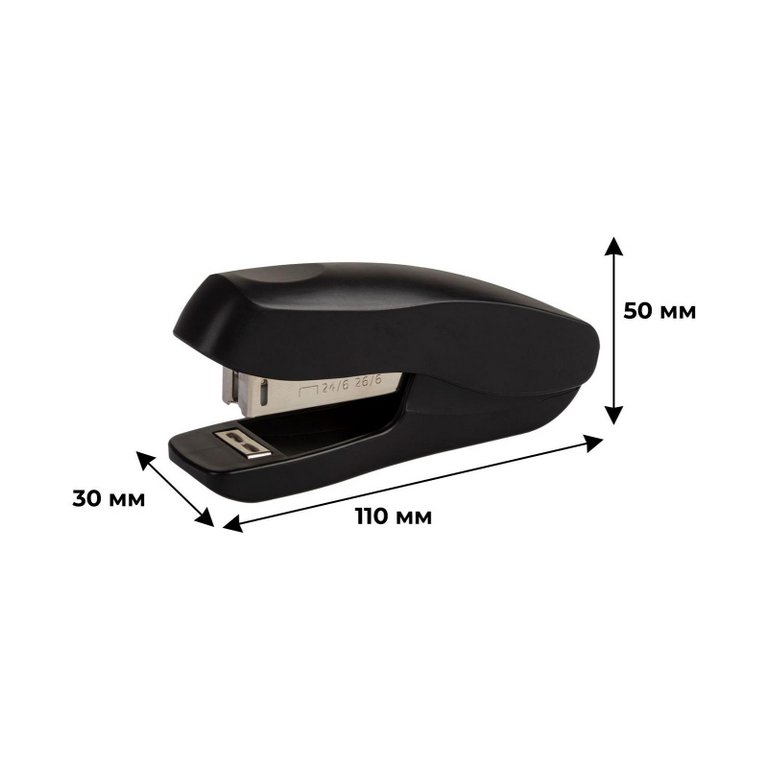 совместим со скобами № 24/6 и 26/6. Глубина закладки бумаги - 38 мм (3.8 см). Размер изделия: 110x50x30 мм.