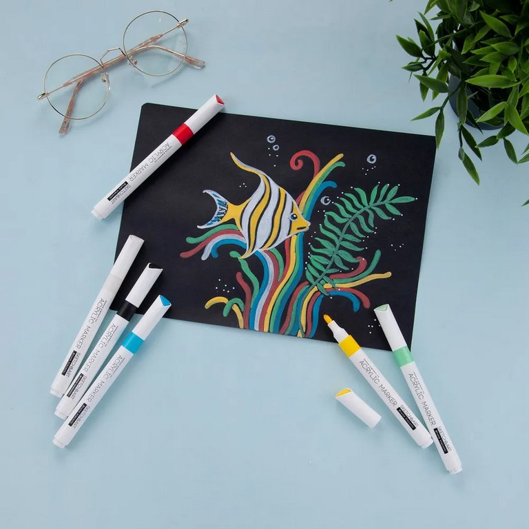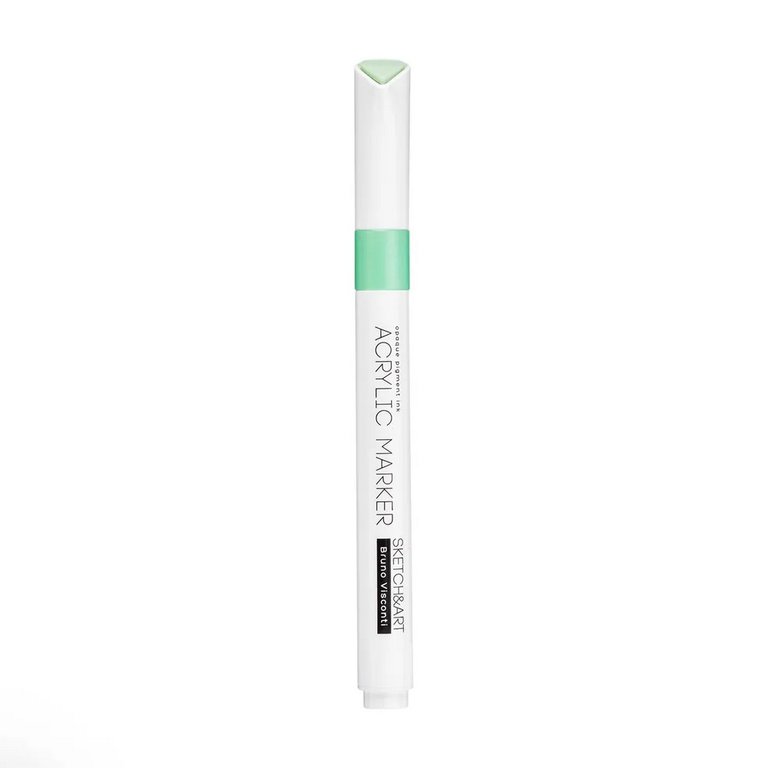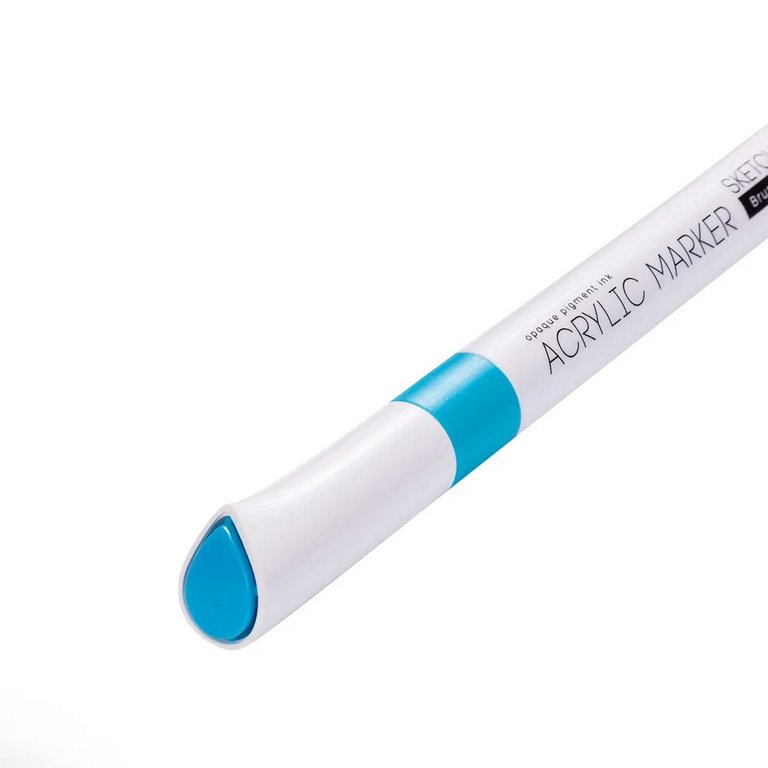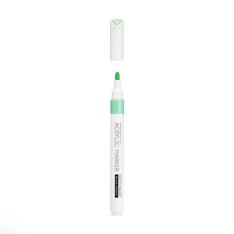 Маркер имеет пулевидный наконечник из износостойкого волокна с шириной линии 1-3 мм. Нетоксичные пигментные чернила на водной основе с высокой степенью укрывистости быстро сохнут на поверхности, оставляя яркий след. Краски до высыхания можно смешать или растушевать кистью для достижения плавных переходов.