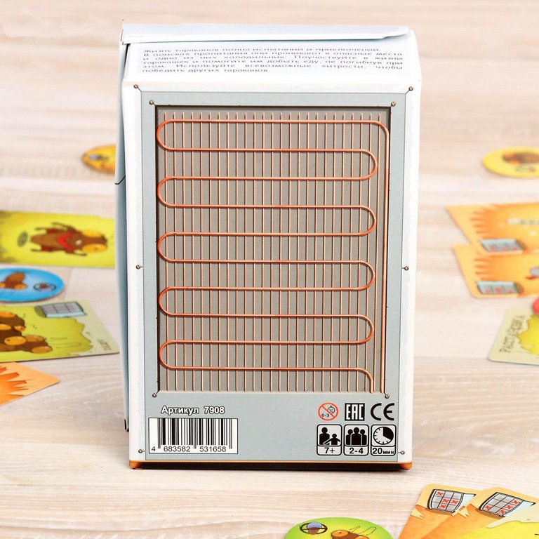 В комплект входят круглые жетоны таракашек, яркие карточки с изображением колбасы, сыра, сладостей и фруктов, карточки с угрозами, шпаргалки и правила игры. Последние — просты и понятны, а значит, участники, замышляющие дерзкий набег на холодильник, смогут сразу же приступить к делу.