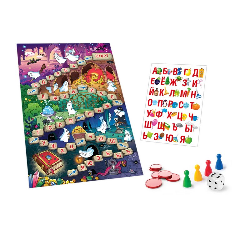 Игровое поле + алфавит +жетоны +фишки +кубик + правила игры |